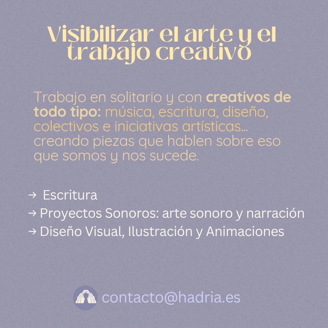 Trabajo en solitario y con creativos de todo tipo: música, escritura, diseño, colectivos e iniciativas artísticas... creando piezas que hablen sobre eso que somos y nos sucede.