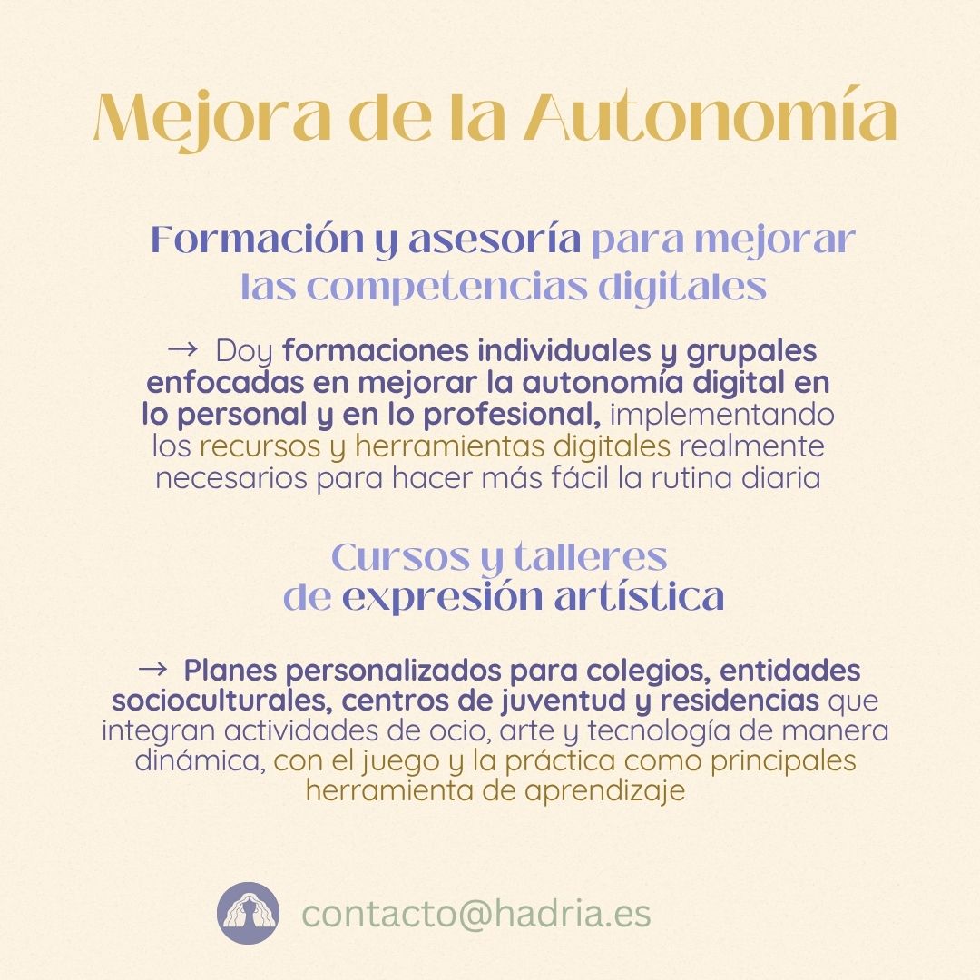 - Sesiones formativas de autonomía digital (diseño web, maquetación, trucos para la autonomía con herramientas digitales…)