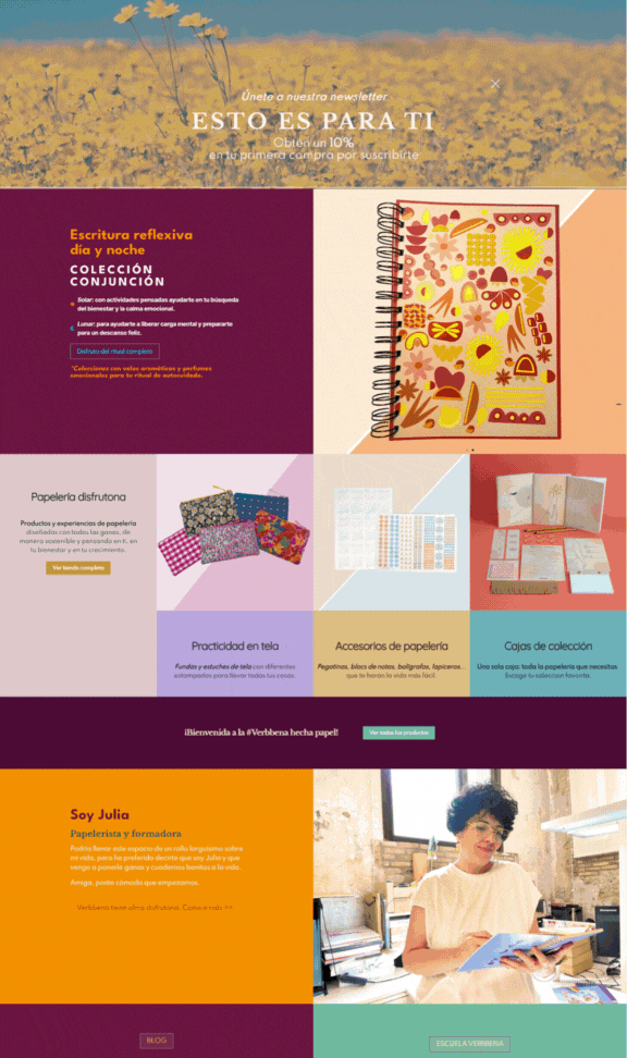 La web de Verbbena está trabajada con mucha intención. Queríamos que los valores destacasen, se leyesen de forma visual y sencilla, pero con carácter. Por eso utilicé elementos gráficos que la misma Julia había diseñado para sus colecciones de papelería, para que sean iconos representativos de cada uno de sus 3 valores principales de marca. Además, este bloque de información se integró a la perfección entre bloques que destacan productos y servicios, dándole coherencia a lo que se está transmitiendo: cuando compras en Verbbena, no compras papelería producida a gran escala, con sistemas poco sostenibles, si no todo lo contrario; compras cercanía, cuidado por los recursos y los detalles, y altas dosis de personalización.